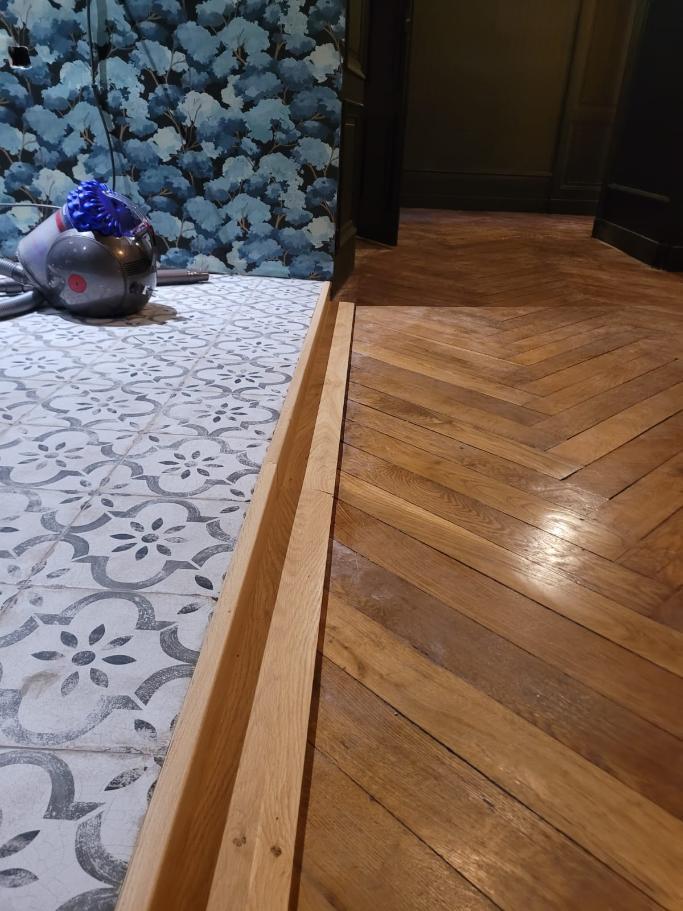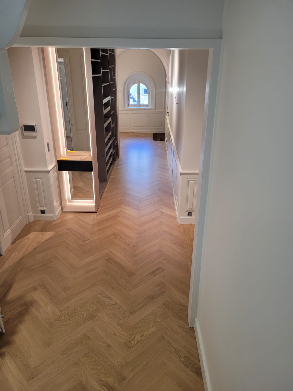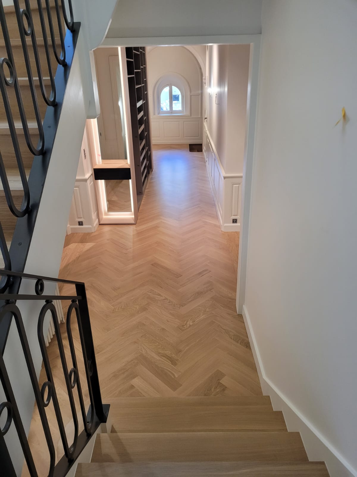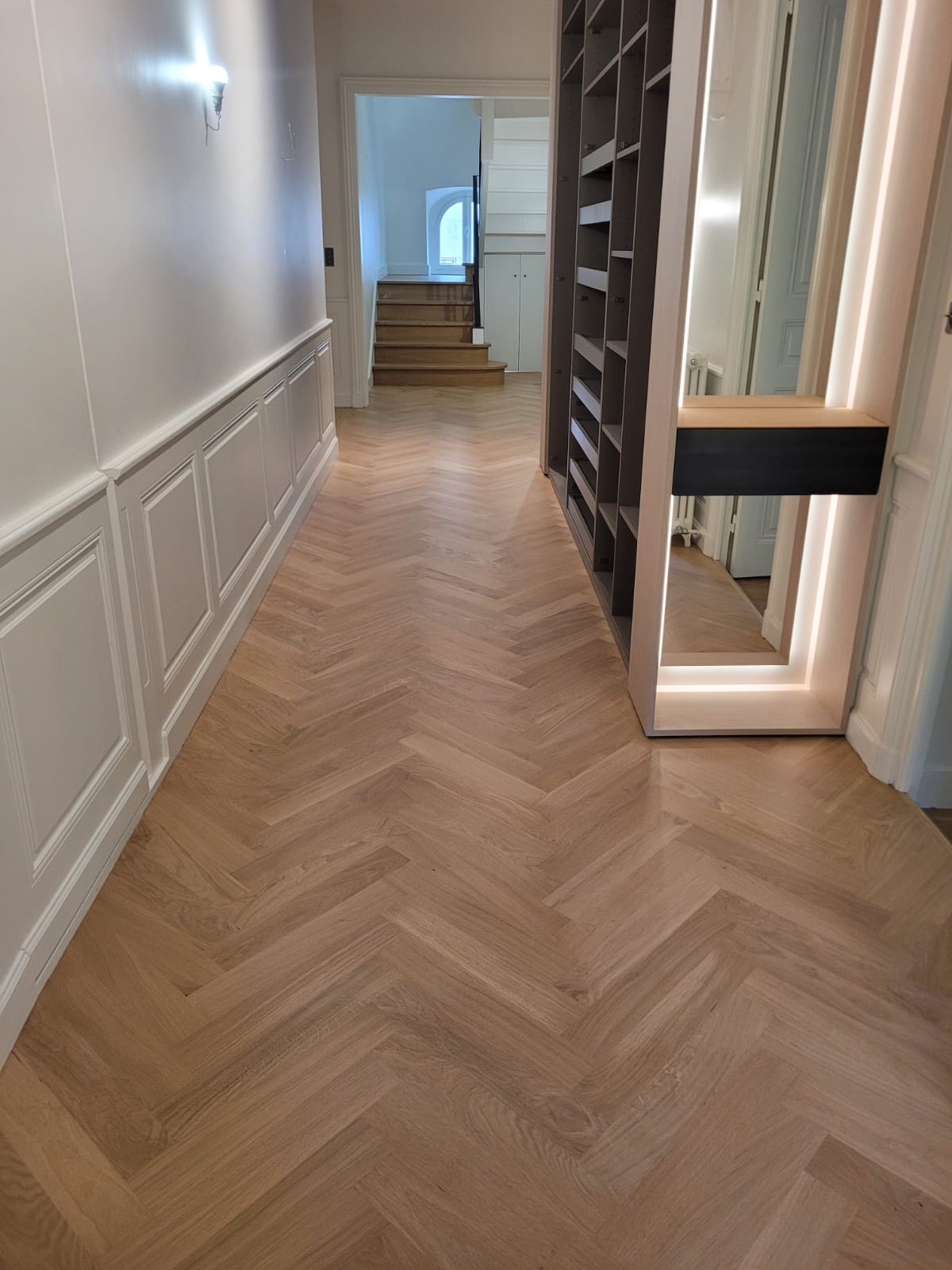 - Le 22mm : conseillé à pose clouée à l’Anglaise, coupe de pierre, bâtons rompus, panneaux chevillés, style Versailles, Aremberg etc…Il se finit sur place, et sa teinte peut s’adapter à votre décor.